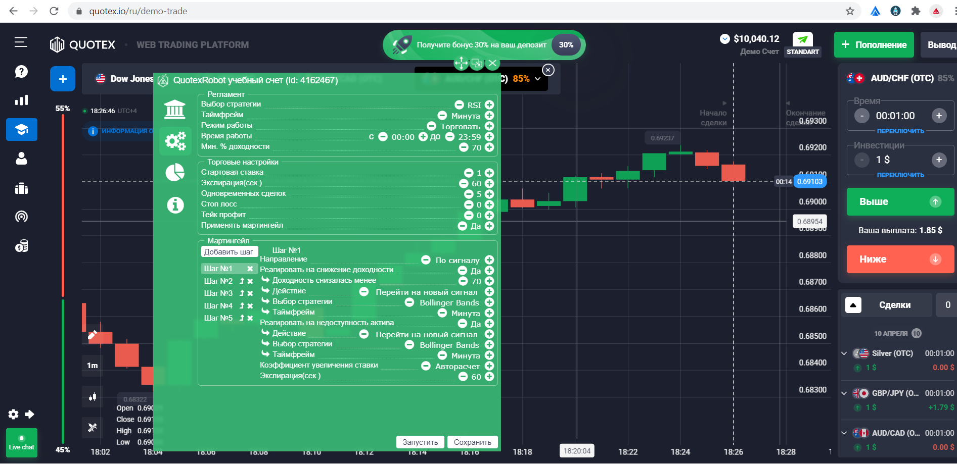 Автоматическое открытие сделок на платформе согласно выбранной стратегии